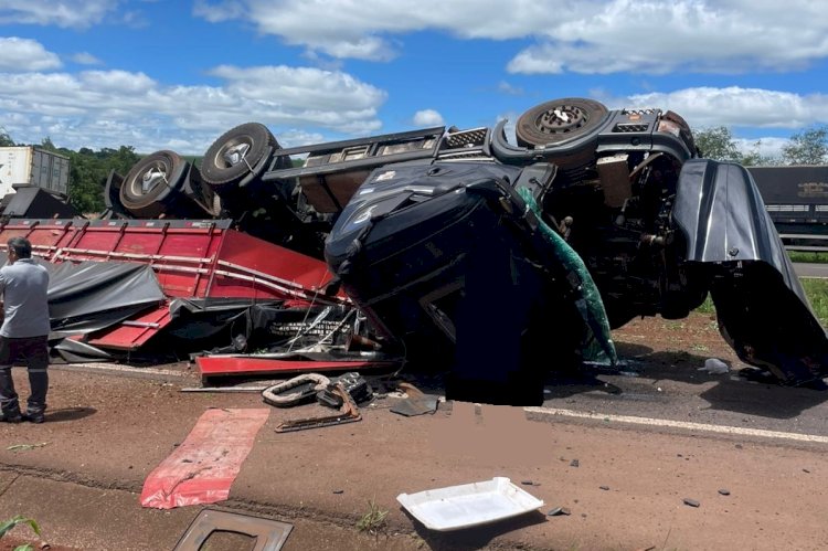 Caminhão tomba na rodovia entre Cascavel e Toledo e deixa três feridos