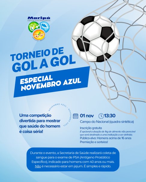 O Governo Municipal de Maripá informa que o Torneio de Gol a Gol – Especial Novembro Azul, inicialmente marcado para o dia 8 de novembro, foi antecipado para o dia 1º de novembro.