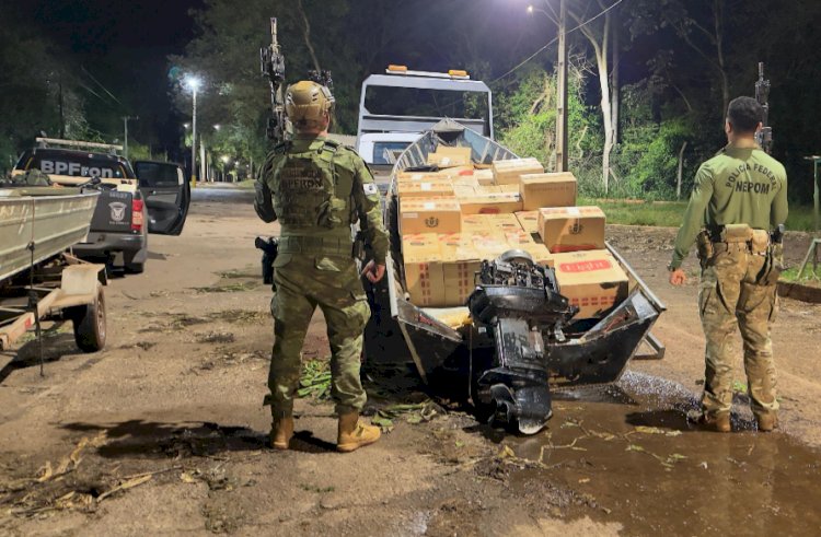 Nesta terça-feira (23/09), a Polícia Militar do Paraná, por intermédio do Batalhão de Polícia de Fronteira - BPFRON, no âmbito da Operação Protetor de Divisas e Fronteiras, em ação conjunta com a Polícia Federal – NEPOM/GRA, realizavam patrulhamento embarcado no Lago de Itaipu, quando avistaram uma embarcação proveniente do Paraguai em direção ao Brasil, transportando diversos volumes. Ao perceber a aproximação policial para abordagem, o piloto iniciou fuga, abandonando a embarcação na margem brasileira, na região da rampa do Arroio Guaçu, município de Mercedes-PR. No local, os policiais localizaram uma embarcação de alumínio de aproximadamente 7 metros, equipada com motor de popa com características suprimidas, possivelmente um Mercury 40 HP, onde foi localizada a quantia de 2.500 (dois mil e quinhentos) pacotes de cigarros contrabandeados do Paraguai. As equipes realizaram buscas na área, a fim de localizar o suspeito, porém sem êxito. A embarcação e os volumes apreendidos foram encaminhados à sede do NEPOM/GRA em Guaíra para os procedimentos legais cabíveis.