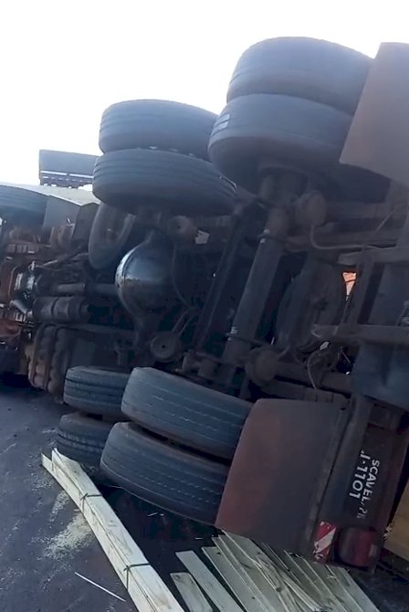 Ao tentar realizar a manobra no trevo, o motorista não conseguiu concluir o contorno, resultando no tombamento já dentro do próprio trevo. A carga de madeira ficou espalhada, ocupando parte da via.