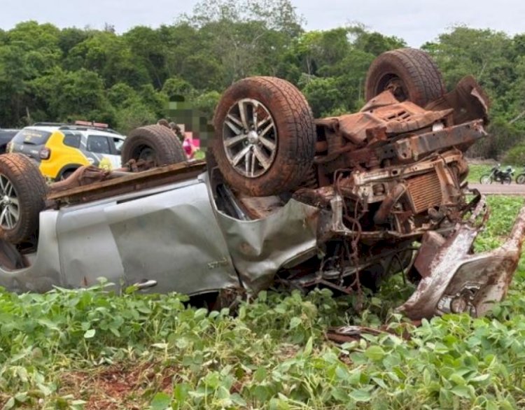 Veículo ficou completamente destruído após capotar várias vezes; duas vítimas estavam na caçamba no momento do acidente